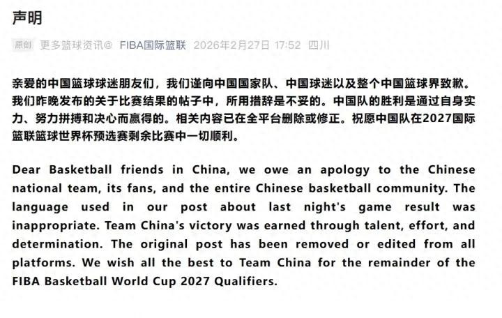 FIBA官方发表声明,向中国男篮致歉......