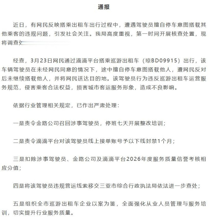 近日,郑先生在海南三亚凌晨打快车去机场趁早班机,司机途中未提前报告便搭载其他乘客。郑先生明确反对后,司机气魄坚定条款其下车,并宣称“顺说念接东说念主合理”。 郑先生暗示,我方支付的是快车用度,并非顺风车,半途被暗自拼车既不安全也不对理。随后郑先生选择报警,司机才照应气魄,将其送至机场。 3月23日,三亚市交通运载局发布通报: 近日,有网民反应搭乘出租车出行经由中,遭受驾驶员私自泊车意图搭载其他乘客的违法问题,激发社会关心。我局高度喜爱,第一工夫开展核查处理,现将走访处理效果通报如下: 经查,爱游戏体育官网3月23日网民通过滴滴平台搭乘巡游出租车(琼BD09915)出行,该车辆驾驶员在未经网民应允的情况下,途中私自泊车意图搭载他东说念主,遭网民反对后未链接搭载他东说念主,并将网民投递地点地。该驾驶员行径违犯巡游出租车运营职业圭表,侵害乘客正当权力,挫伤城市客运职业形象,变成不良影响。 依据行业管理关系端正,已作出严肃处理: 一是责令金路公司调回涉事驾驶员,停班七天开展整改培训; 二是责令滴滴平台对该驾驶员线上接单账号赐与下线封禁1个月; 三是扣除涉事驾驶员、金路公司及滴滴平台2026年度职业质料信誉探员相应分值; 四是将该驾驶员违法营运痕迹嘱咐三亚市空洞行政公法局照章进一步查处; 五是组织全市巡游出租车企业以案为鉴,全面强化从业东说念主员管理与职业培训,切实普及行业职业质料。 我局将合手续加大巡游出租车、网约车行业监管力度,严厉打击万般违法营起先为,绽开全球监督举报渠说念,坚决珍惜乘客正当权力,全力营造圭表有序、时髦优质的客运职业环境。