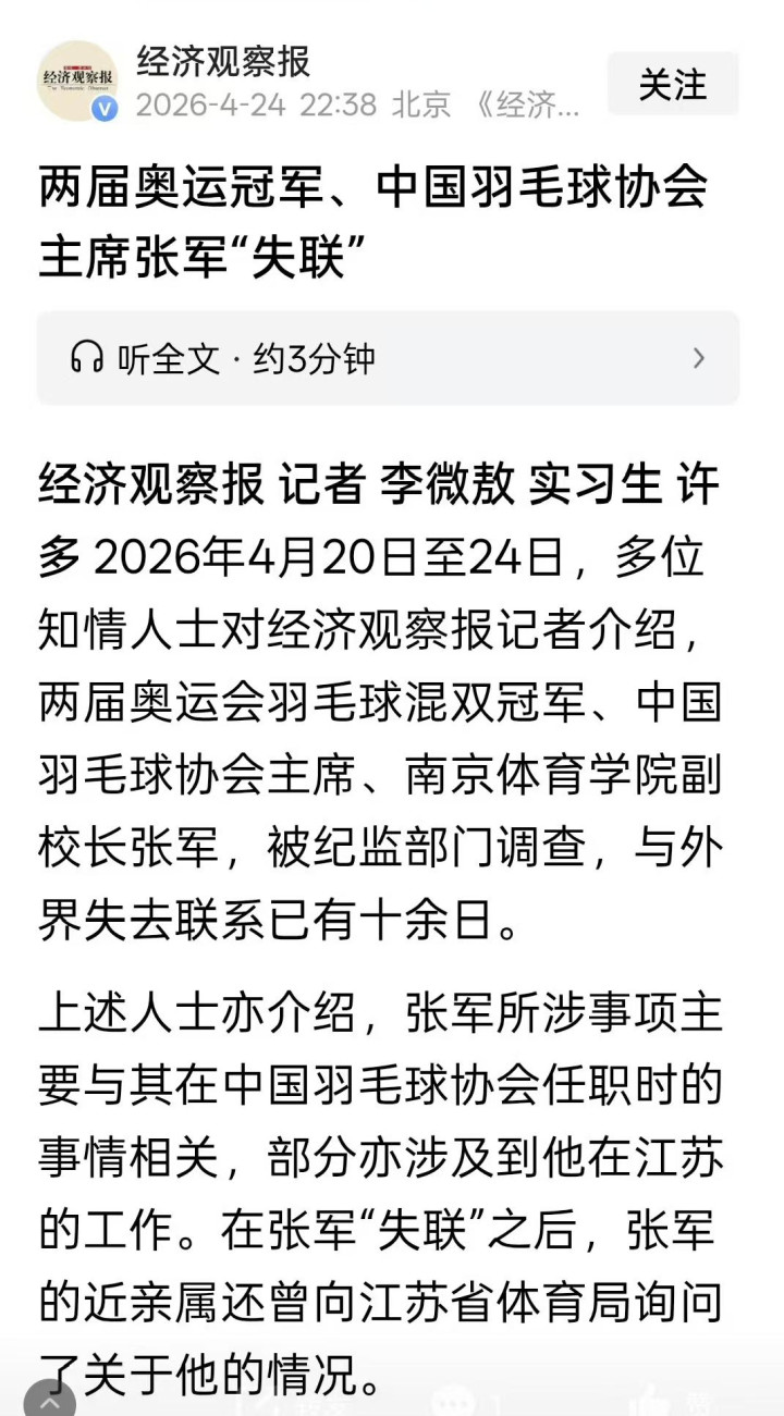在报说念中,记者李微敖暗示把柄多名知情东说念主士对经济不雅察报记者先容,两届奥运会羽毛球混双冠军、中国羽毛球协会一霸手、南京体育学院副院长张军,被纪监部门看望,张军也曾和外界失去了相关十余日了。 名记李微敖在报说念上爆料,把柄知情东说念主士领略,爱游戏体育官网张军所触及的主要事情是他在羽协任职本领的事情,部分也关系到他在江苏的职责。李微敖强调,在张军失联后,张军的嫡支属还曾向江苏体育局斟酌他的情况。 为了证明报说念的着实性,经济不雅察报的记者暗示斡旋多日拨打张军的手机,关联词张军的手机一直处于关机的景况,而在向中国羽协办公室斟酌的本领,对方的修起是不了解张军的情况,也不了了近期张军是否来到羽协办公。