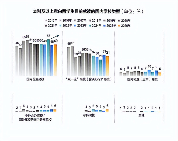 留学主体大洗牌: 从精英专属到平日群体 留学早已不是高学历、高净值家庭的专属领受,本科生、平日院校学生、高知家长加抓的平日家庭,共同组成了当下留学阛阓的中枢群体。 从就读阶段来看,高级讲明阶段成为留学的所有主力,2026年本科在读学生留学意向占比达63%,创12年新高,加上硕博群体,本科及以上阶段留学意向共计占比高达77%, “不息深造”仍是留学的第一驱能源。中小学阶段留学意向占比仅23%,留学低龄化趋势不再突显,高级讲明阶段的学历进步需求成为主流。 从院校布景来看,平日高校意向留学生占比49%恒久居首,远超双一流高校的31%,中小学阶段则是公立平日班占比55%成为主力。留学不再是名校生的“镌脾琢肾”,更是平日学校学生获得优质讲明资源、突破学历天花板、达成“学历进阶”的紧迫旅途。