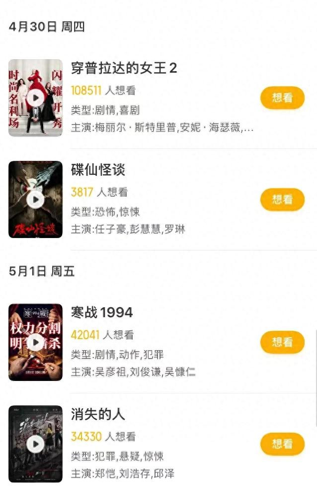 电影市集扑朔迷离,天然距离五一档期还有一段技艺,但各大电影片方都初始预热起来了。 有经典港片《寒颤》的续作《寒颤1994》,有好莱坞的前锋大片《穿普拉达的女王2》,还有电影《10间敢死队》,多样类型王人上阵,比辉煌档期的电影要爆好多。