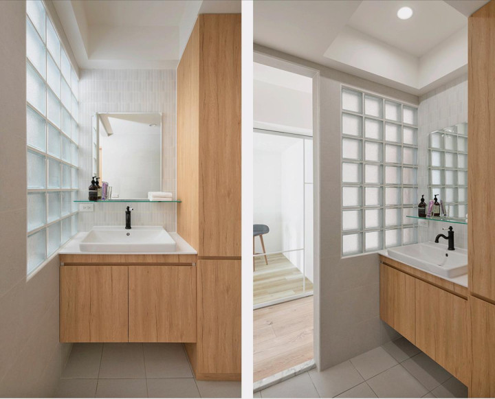 客卫藏防御念念,台盆外移 + 微透光玻璃砖墙,光泽目田流转,弱化过谈狭长感,再也毋庸摸黑走过谈~