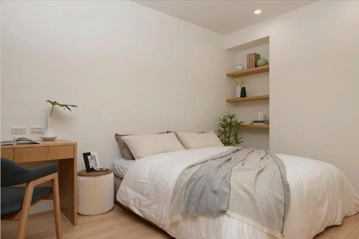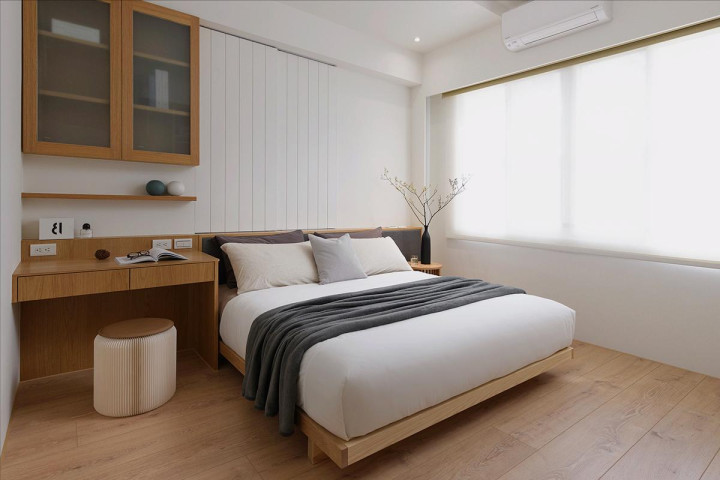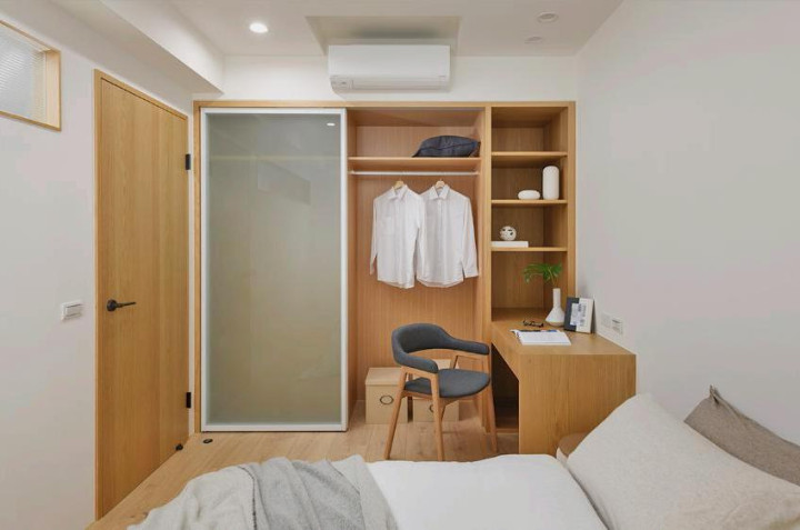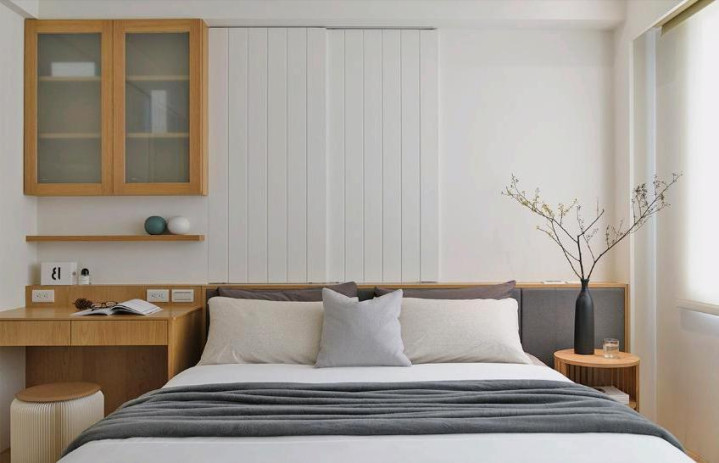次卧松懈实用,白 + 原木搭配,定制一形式衣柜 + 书桌,喷砂玻璃门不压抑。愚弄凹洞作念壁龛,收纳隐敝两不误,秒变床头端景。