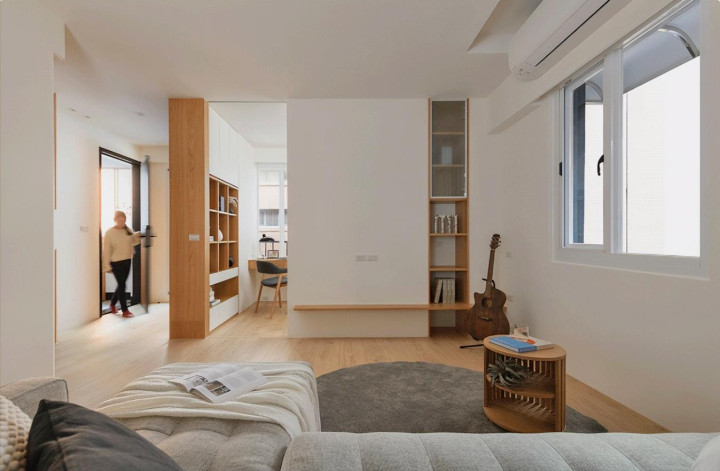 客厅走极简摆烂风,莫得牢固配色和深奥茶几,广宽到能打滚!白 + 原木经典搭配,当然敞亮不失实,主打一个适意。电视墙没搞复杂造型,一组原木展示柜 + 隔板,营救大白墙单调,后方改成洞开式书斋,采光胜利翻倍,再也不暗千里千里。