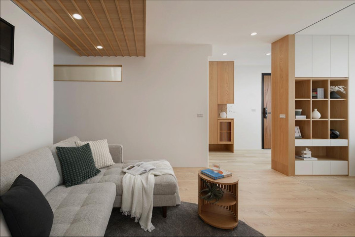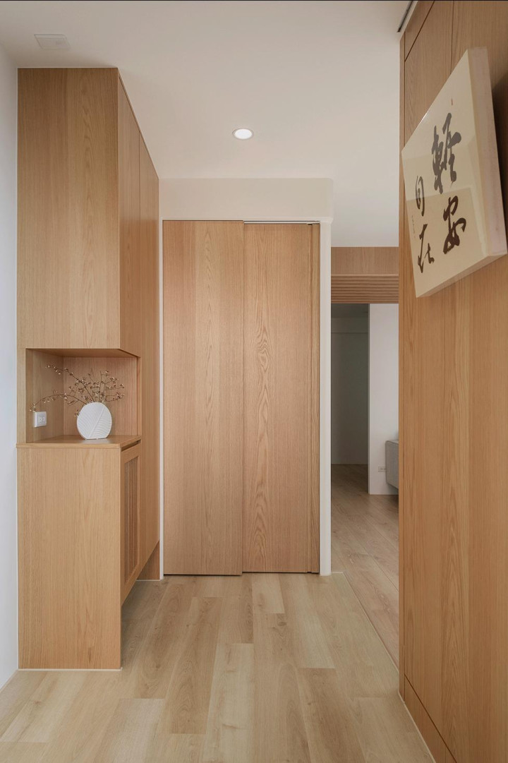 玄关改良后从 “无” 变 “有”,满眼调理原木色,进门就卸困顿。左侧顶天当场鞋柜,局部镂空放钥匙、包包超方便,前端还藏了储物室,木质推拉门一装胜利 “隐身”,颜值实用双在线。