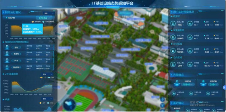 该智力可匡助运维责任从“斥地视角”转向“业务视角”,优先保险中枢造就、料理业务寂静动手,减少业务故障对师生的影响,径直擢升信息化工作保险智力。 03长入可视化展示,竣事全校态势精确感知 决策通过长入的可视化展示模块,对学校合座信息化动手态势进行集结呈现,构建掩饰全校网罗、用户接入及区域散播的抽象视图。系统以可视化格式整合种种中枢运维数据,将复杂的网罗动手信息、斥地状况数据出动为直不雅、易懂的图形化展示,全面擢升学校IT运维的态势感知智力。