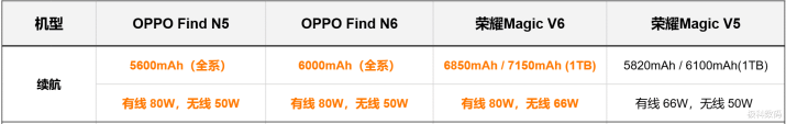 2、续航才调 荣耀Magic V6:顶配7150mAh,粗浅版6850mAh,行业卓绝 OPPO Find N6:6000mAh,续航优秀但不如荣耀V6 荣耀Magic V5:6100mAh(顶配)/5820mAh OPPO Find N5:5600mAh,四款中最小