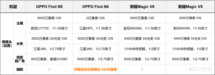 3. 影像系统 OPPO Find N6:2亿像素哈苏四摄+丹霞色召回复镜头,建树最豪华 荣耀Magic V6:6400万潜望长焦,提拔CIPA 6.5级防抖 OPPO Find N5:800万的超广角略失容一些 总体来说,OPPO Find N6的镜头建树上风比较大,影像算法也比较杰出。