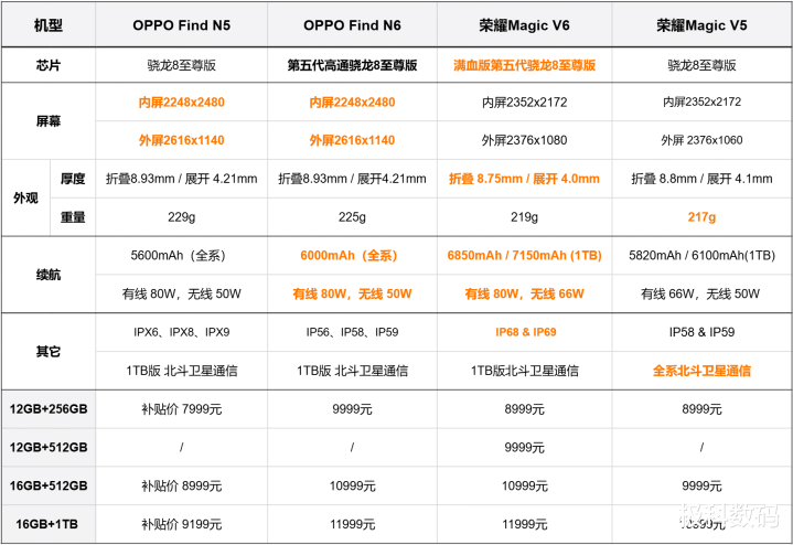 (二)不及之处 夸已矣亮点,我们也得客不雅聊聊Find N6的不及。 1、价钱涨了 因为存储加价的相干,Find N6的起售价来到了9999元(12+256GB)。比较上一代Find N5,涨了小一千。固然建树升级,但关于预算明锐的用户来说,这一千块的差价如实不小。顶配的1TB卫星通讯版更是达到了11999元。 2、分量截止不如荣耀 Find N6的分量是225g。固然在大折叠里不算重,但对比荣耀Magic V6的219g、Magic V5的217g,还是稍重了小数。如若你相配介怀“极致漂荡”的手感,荣耀那两款拿在手上会更简略一些。 3、处理器并非“满血版” Find N6搭载的是第五代骁龙8至尊版,但砍掉了一个中枢。固然是旗舰芯片,日常使用齐全够用,游戏阐发也可以,但关于追求“顶配必须拉满”的用户来说,心里可能会有点小疙瘩。荣耀Magic V6的“满血版”第五代骁龙8至尊版,主频更高,表面性能更强。 4、防尘规格稍弱 驻防方面,Find N6提拔IP56+IP58+IP59,防水拉满,但防尘只到5级。 二、四款折叠屏横向对比 聊完Find N6,我们把它和另外三款主流折叠屏——OPPO Find N5、荣耀Magic V6、荣耀Magic V5放在一王人,望望各自的中枢定位。
